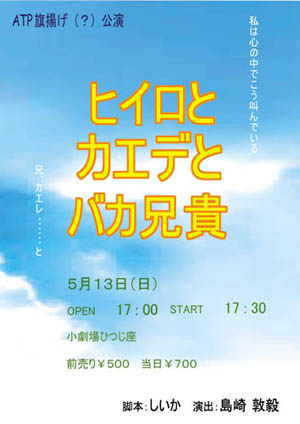 PASSグループの進捗情報などを、【近況】【今後の予定】【おまけコーナー】の3本立てでお届け。毎月15日発行。──────────【近況】〇PASSグループ新型コロナウイルスの感染拡大に伴い、活動の自粛をしております。【今後の予定】〇Project-Pandora7回目の生放送を予定しておりますが、日程などは未定です。続報をお持ち下さい。【おまけコーナー】《もーそーシャッフル配役》それぞれの企画を代表する演目を、PASSグループのメンバーで配役します。〇企画名表現集団ATP〇演目名〇あらすじ親を亡くし、姉妹2人で暮らしているヒイロとカエデ。2人には兄が1人いるのだが、その兄は昔に家を出た切り帰ってこない。お隣さんや彼氏が気を使ってはくれるが、日々の生活は苦しく…「兄、カエレ」と思っていた矢先、なにを思ったのか、兄が帰ってきた。外人の女を連れて。暫く泊まっていくという兄を中心に、各人の感情や思いが爆発していき…渦中で楽しそうに笑うバカ兄貴。果たしてその狙いは?〇配役・ヒイロ…(青葉彩花)長女。大学卒業ぐらいを想定。翻訳家として、両親が亡くなり、兄までいない一家の生活を支えている。口癖は「兄、カエレ」。※選考理由気が強くて口も手も乱暴。でも内心では頼りたかった時に頼れる人がいなくて、自分が立つしかなかっただけの女の子。だからこそ、妹の前ではお姉ちゃんで、兄の前では妹になるし、恋人の前では女性になる。そんな表情というよりは、出てくるポジションの違いを素直にだしてくれるんじゃないかと期待。・カエデ…(渡辺みにえ)次女。高校生。貧乏だけど明るくおおらかで頭からっぽ。兄大好き。甘えさせてくれる人大好き。※選考理由頭からっぽのほうが夢詰め込める。そんな天真爛漫な部分をうまく表現してくれそう。一方で、自分の将来や家庭環境という、リアルな部分と接したときの「まっとう」な部分も出してくれそう。・アニキ…(kazu)若い時に家出してそれっきり音沙汰もなかった長男。20台半ば程度想定。やりたいことやって生きてきたちゃらんぽらん。しかしながら、意外と周りの人間たちからは嫌われていないようで…※選考理由憎めない、適当なようで芯があり、無駄に行動力があって周りがふりまわされる。うん、kazuでいいんでないかな?・アン…(池尾唯)兄がつれてきた外人女性。二十台半ばぐらい?彼女というよりは、秘書やマネージャーのように振る舞う。颯爽とした「できる女」のようだが、その実は…※選考理由PASSメンバーのなかで『大人の女』をやってもらうなら、ゆいぽんかなと。自信があってづかづかいきながらも、意外と周りのことをみている…というような部分もあってるんじゃないかな?・リク…(横溝大希)ヒイロの彼氏。同年代かちょっと上ぐらい。ヒイロの尻に敷かれるちょっと情けないところもあるが、サラリーマンとしてまっとうに働く社会人。けして持てないが、旦那にするにはいいと思えるタイプ。※選考理由横溝アニキもみてみたかったが、初演でリクをやった横溝さんが、今これやるとどうなるかを見てみたいというのが勝った。若さと人の好さだけでなく、年齢重ねてでてくる何かが加わった時、このキャラクターの味がますんじゃないかなぁ。・ウミ…(やわも)お隣に暮らす人妻。アニキと同学年。アニキに振り回される同盟(?)の一員でもあり、ヒイロとカエデの理解者であり、支援者でもある。どうやら昔はアニキに惚れていた過去があるようだが…※選考理由おせっかいな隣のおねーちゃん。色々あったけど腹割って話せる女友達。ゆいぽんとやわもで、アンとウミどっちがいいか悩みましたが、最終的に、やわものフランクさ、大阪のおばちゃんっぽさからこちらに配役しました。〇当時の思い出など・表現集団ATPの旗揚げ(?)公演の演目。養成所の仲間が定期的な練習の場を求めて集まったのが始まり。練習として1本演劇をやることにし、出来上がっていくにつれ「ちゃんと団体として上演しよう」となり、旗揚げ決定。とはいえ実はその前に、地域の各所ででちょこちょこ演目を披露するなどしていたため、本来の意味の旗揚げっていうのか?となり『(?)』がついたのでした。あと、ハタアゲ公演なので、来場者に手作りの旗(オムライスにさしてあるようなの)をプレゼントしておりました。1点1点、団員が手作り。その前の、練習メインで集まっていた団体名『Angels Tea Party』の頭文字をとって。・略称は『ヒデキ』だった!?当時、代表の島崎が上演前の会場アナウンスの際に、お客様の前に立っておりました。その際に、受狙いで『ヒデキ』といったのが始まり…だったか、その前の稽古の段階ですでに『ヒデキ』だったか…なお、会場では意表をつけたせいか、そこそこ受けていた気がします。気がするだけかもしれませんが。・この演目の反響を経て『パンドラの劇場』が生まれた。当時、本当に続けるかは謎に包まれておりました。が、良くも悪くも手ごたえがあったこともあり